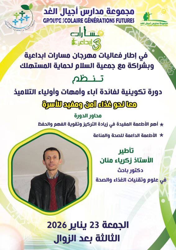 دورة تكوينية لفائدة أباء وأمهات وأولياء التلاميذ الكاتب: zakaria manane كتب في: يناير 23, 2026 فى: الصحة, مستجدات | تعليقات : 0 معا نحو غذاء آمن ومفيد للأسرة Tweet Share › السابق التالى ‹ اكتب تعليق انقر هنا لإلغاء الرد. الاسم* البريد الألكترونى* موقعك إرسال التعليق Δ