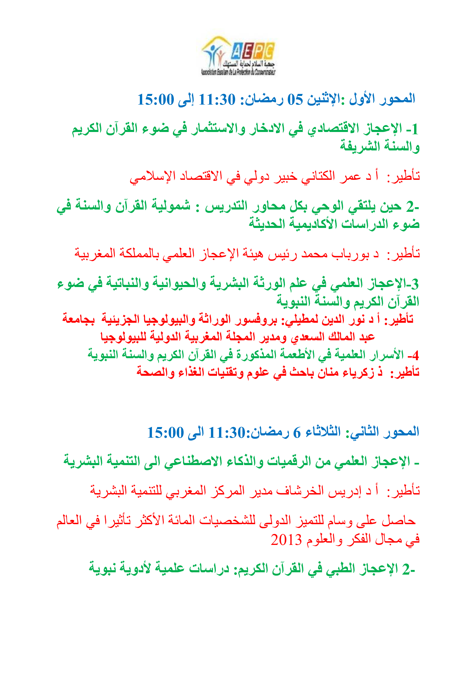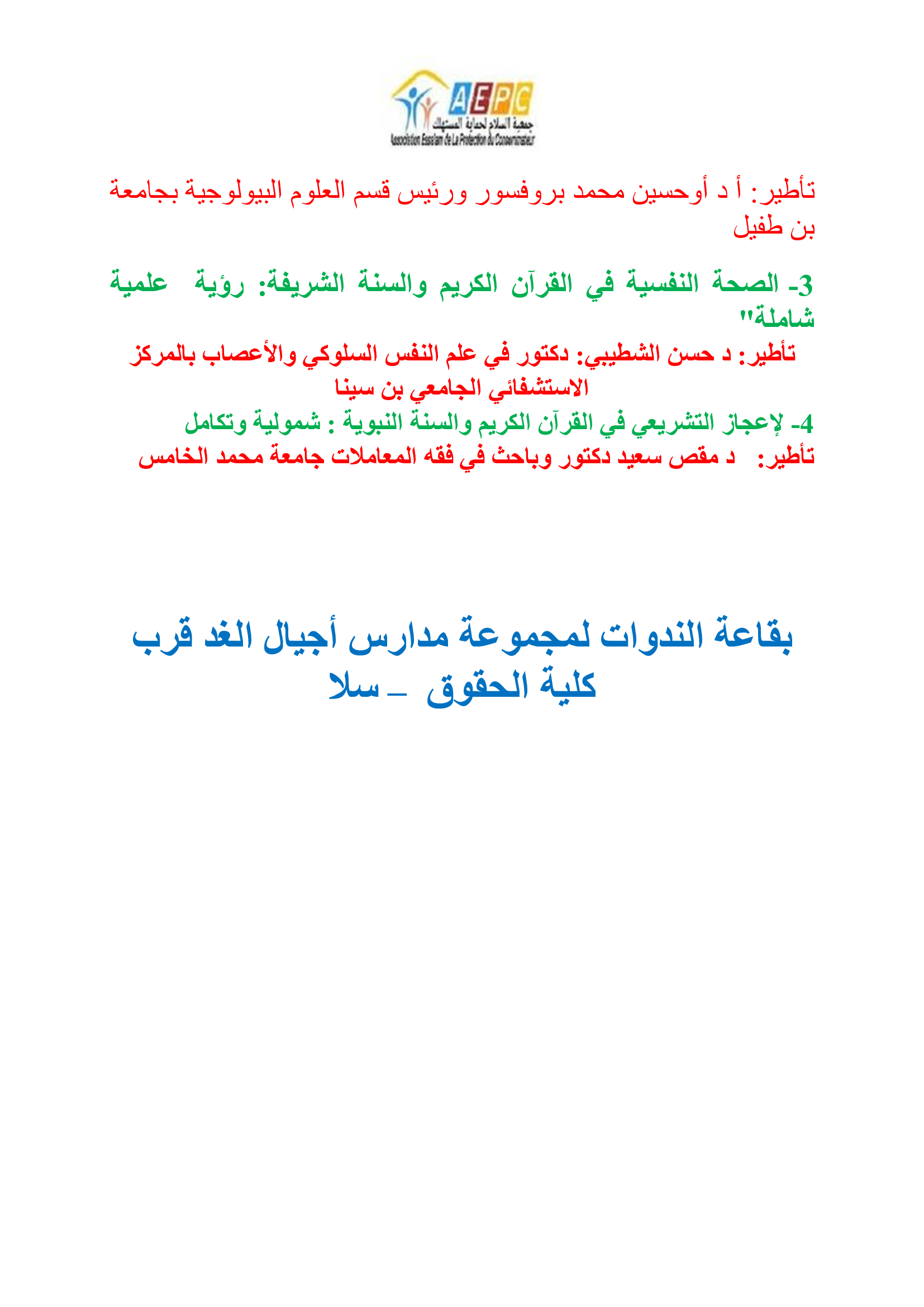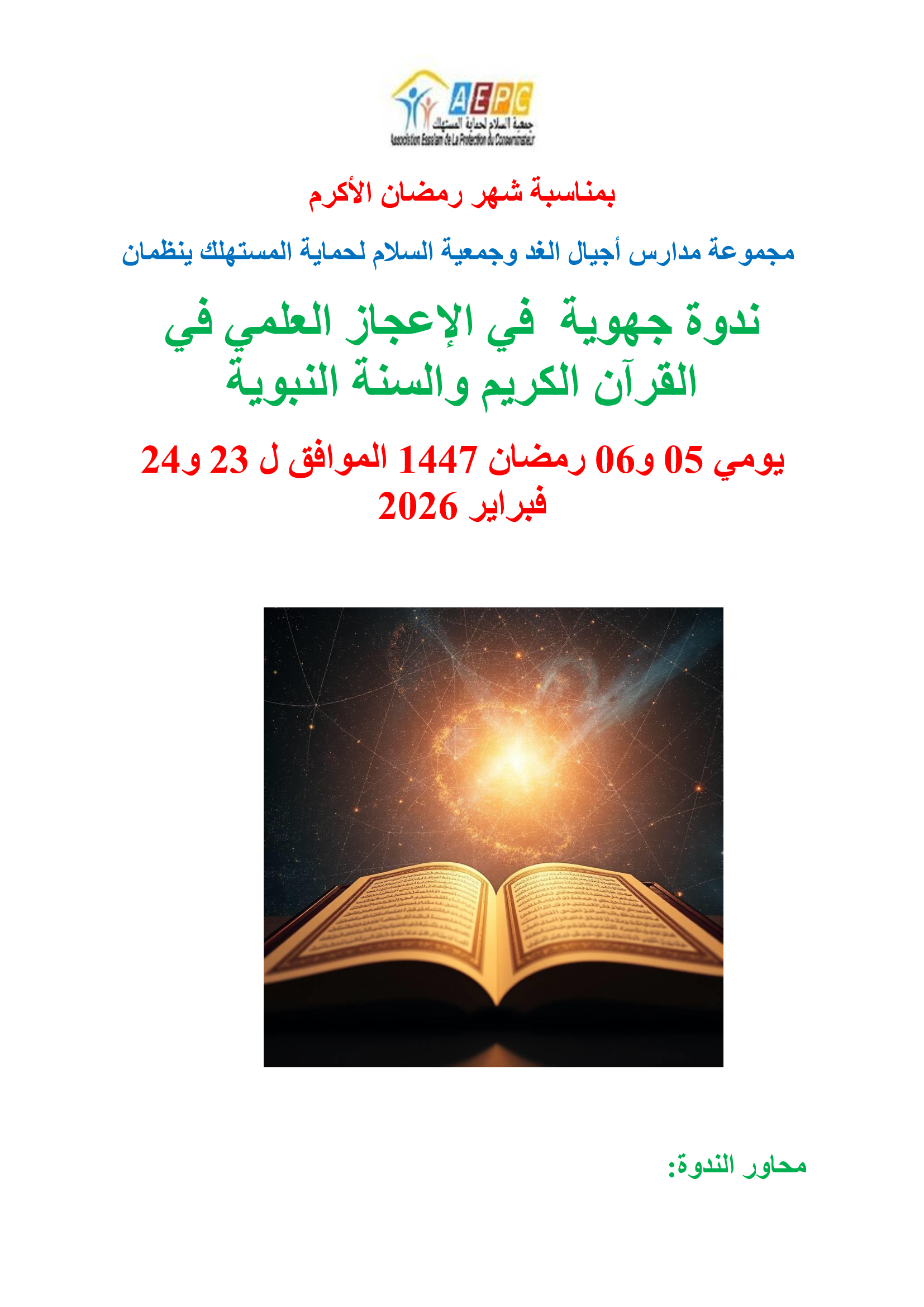 ندوة جهوية في الإعجاز العلمي في القرآن الكريم والسنة النبوية بسلا يومي 05 و06 رمضان 1447 بحول الله الكاتب: zakaria manane كتب في: فبراير 16, 2026 فى: الأبحاث و الدراسات, مستجدات | تعليقات : 0 Tweet Share › السابق اكتب تعليق انقر هنا لإلغاء الرد. الاسم* البريد الألكترونى* موقعك إرسال التعليق Δ